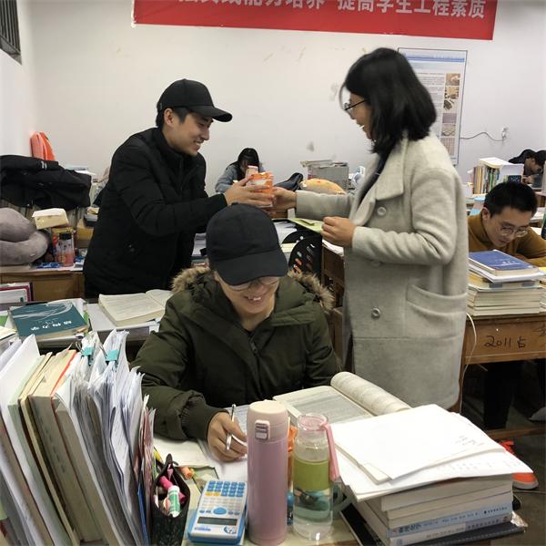 为关心关爱考研学子,为考研学生加油鼓劲儿,在距离今年全国硕士研究生招生考试还有不到20天的时间,12月3日晚,土木工程学院辅导员刘欣然与2015级各班长、团支书一起,到市北校区一教考研自习室,为考研学子送上一杯杯暖暖的奶茶,为考研学子带来冬日的温暖。