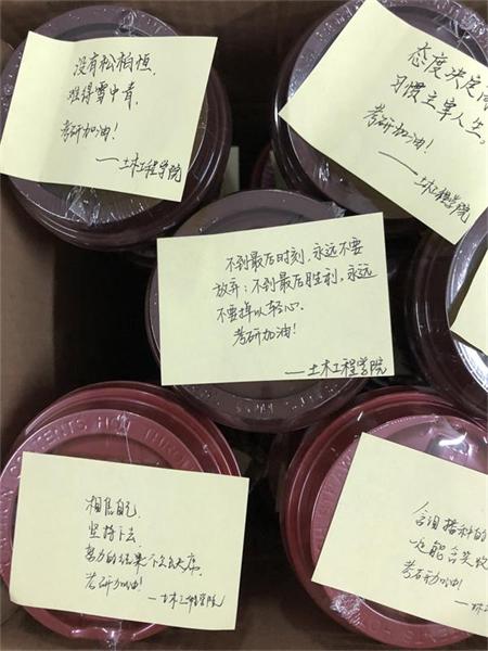 根据教育部公布的数据,今年考研人数达到290余万,是历年来考研人数最多的一年,而土木工程学院2019届毕业生中也有近60%的同学正在备战考研。目前考研同学已进入最后紧张的冲刺阶段,积极的状态、良好的心态尤为重要。为引导学生调整好心理状态,鼓励大家坚持到底,保持信念,土木工程学院为每位学子准备了奶茶,并在每个茶杯贴上手写的鼓励话语,送上全院师生的关怀和寄语,让寒冷的冬日里弥漫起一股暖流。收到奶茶的学生们十分感动,更加坚定了考研必胜的信心。