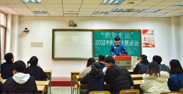 团总支副书记台文彬同学简要向大家介绍了宪法日的由来以及设置宪法日的意义并为大家放映“国家宪法日:依法治国”和“宪法宣传片:印记”学习视频,在座人员认真观看了视频并进行了深入学习。本次活动在在法律知识问答中进入尾声,台文彬对活动进行了总结,表示举办此次活动是为了号召大家更好地了解宪法、重视宪法,得到了在座同学的认同与积极响应。