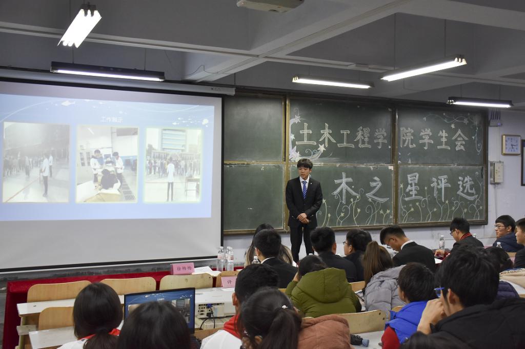 评选伊始,王中帅为本次活动讲话,他表达了对学院全体学生干部在本学期工作的感谢,希望大家在接下来的日子里继续以饱满的热情和充分的自信迎接新的工作和挑战。随后,来自学院三十四位候选人依次登场答辩,每位候选人在三分钟时间内结合PPT,就本学期开展工作情况以及自己的大学生活感悟进行汇报,然后由现场评委进行提问。在答辩过程,每一位候选人都以满腔的热情表达了自己的工作态度和对学生工作的热爱,认真回答评委的问题,通过评委打分,评选出十名同学获得本年度“土木之星”荣誉称号。最后,杜诗琳老师为获奖同学颁发奖状。