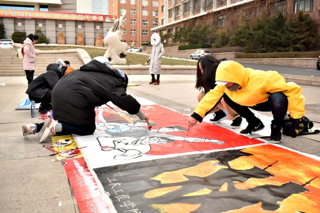 为纪念一二九运动,提高新时代大学生对历史的了解和爱国之情,2018年12月9日8点,环境与市政工程学院在科技广场举办了“梦绘一二九”活动。此次活动得到市北校区各个学院的积极响应。画卷由环境与市政工程学院、建筑与城乡规划学院、土木工程学院和艺术与设计学院一起完成。