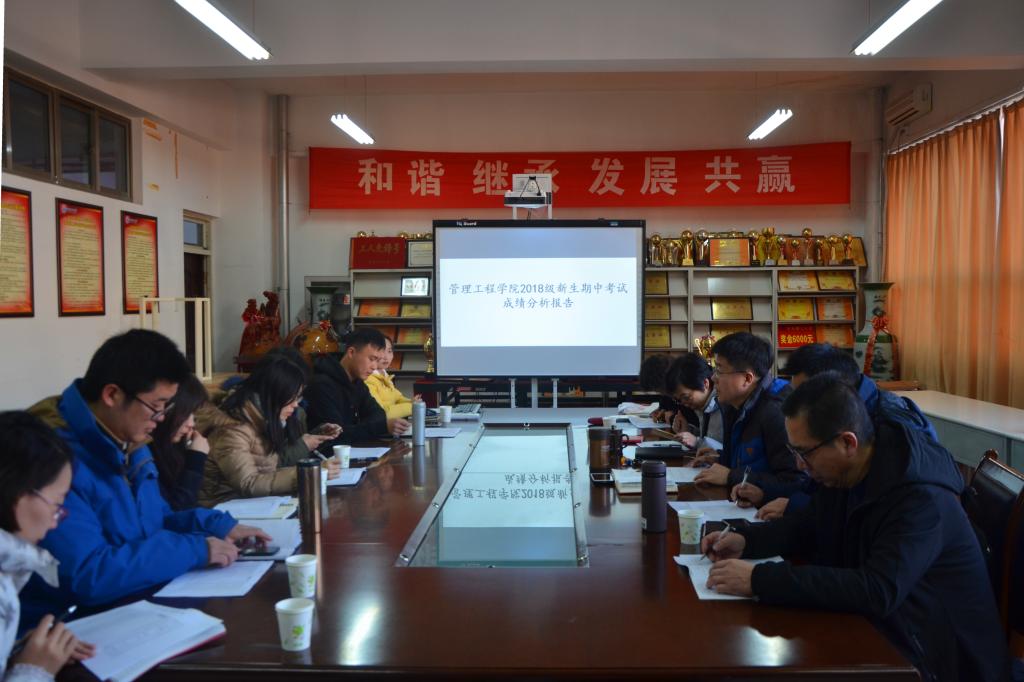 王云霞对期中考试的学院整体情况、各班级情况、各专业情况对比、省内外成绩对比、男女生成绩对比、班委非班委成绩对比几个方面对管理工程学院18级新生期中考试成绩进行了详细分析,通过期中成绩对比提出新生学习中存在的问题并给予改进建议。张翔对学生日常情况进行汇报总结,具体包括宿舍卫生情况、旷课记录、早操情况等方面,着重对宿舍内务问题、学风建设问题、诚信考试等问题等进行强调。