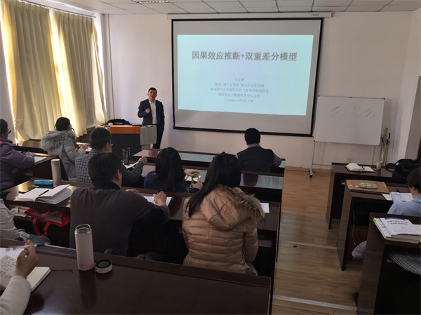 王立勇教授首先对自己的科研情况及心得进行了讲述,并就计量方法在科学研究中的重要作用进行了说明,向在场师生提出科研工作中应该掌握的计量模型及方法。随后,他以“因果效应推断+双重差分模型”为重点进行了解读,具体而言,对计量模型的主要功能、因果效应原理、因果效应推断、内生性问题及双重差分模型(DID)的表述方式、前提假设、平衡检验、多期DID等问题进行了仔细讲解。最后,商学院师生同王立勇教授进行了积极互动,现场氛围良好。