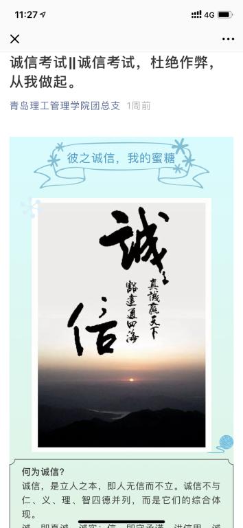 管理工程学院的新媒体平台“365完美体育管理学院团总支”、“管闻天下”微信公众号发布《诚信考试,杜绝作弊,从我做起》主题网文,以诙谐的语言、生动的图片讲述诚信考试与责任感、道德品格的内在联系,获得学生积极点赞并转发。辅导员、班主任在年级QQ群、微信群等沟通平台积极倡导诚信考试言论,转发《365完美体育考试违规的认定和细则》,帮助学生认识诚信考试的重要性。利用网络传播正能量,提高教育工作的感染力和渗透性。
