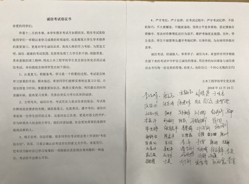 学院学生党员积极响应学院号召,向全体同学发出诚信考试倡议,并在倡议书上签字,以榜样的力量带动身边的同学诚信应考。学生会各部门、社团代表纷纷签订诚信考试倡议书,并张贴在1号教学楼,向全体土木学子发出倡议。