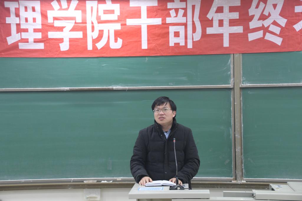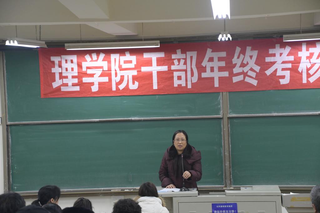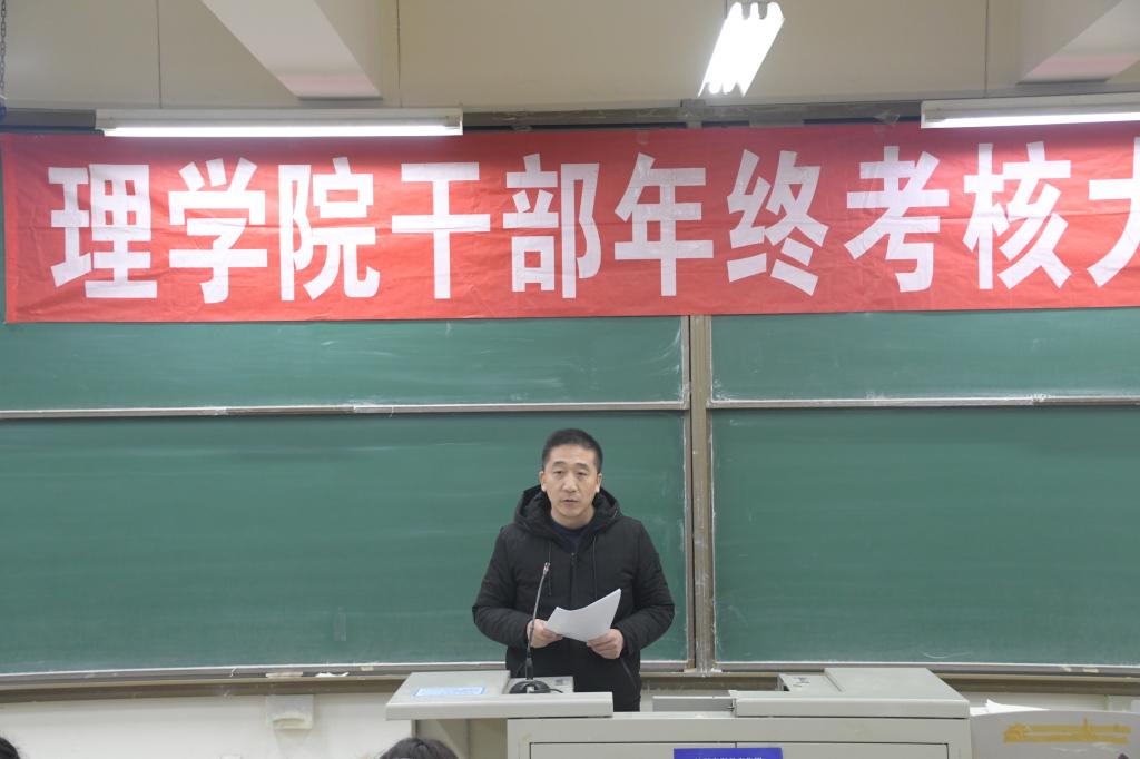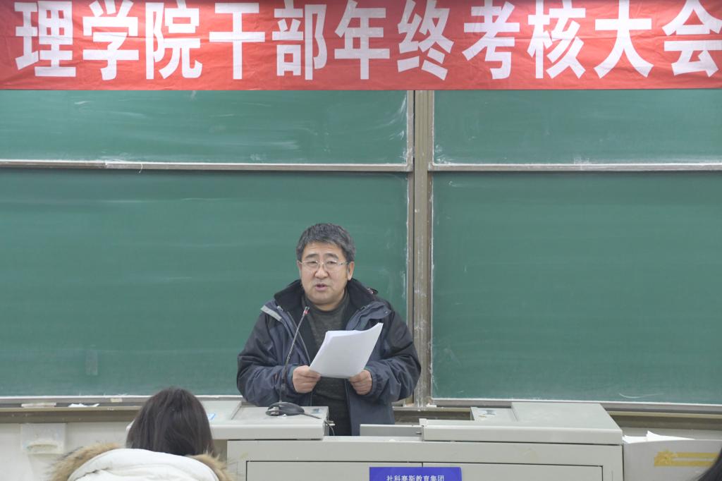 1月9日下午,理学院在嘉陵江路校区主教学楼B225教室召开了干部考核及年度总结大会,理学院全体教职工参加会议,黄岛校区办副主任田洪杰对干部考核会议进行监督和指导,会议由于进伟院长主持。