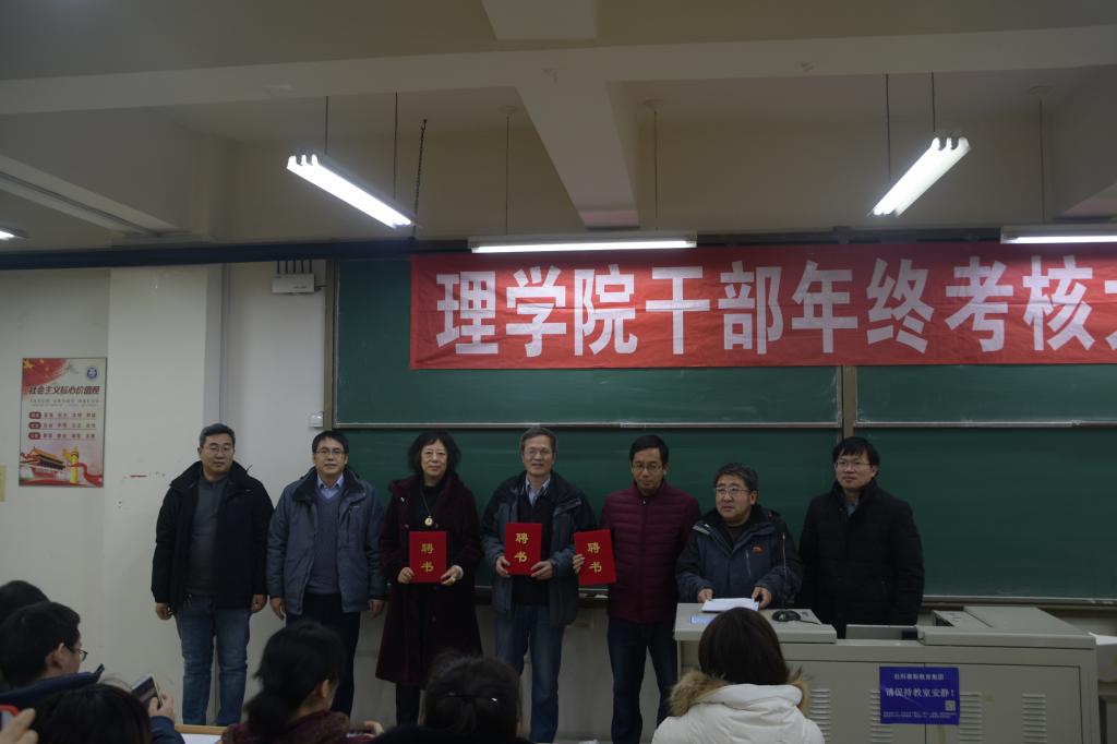 于进伟院长对各教研室主任和副主任进行任命,介绍新引进高层次人才孙可明教授及新进教职工,理学院聘用工作小组、文件起草小组、秘书小组相关人员构成,并听取学院各分管领导年度工作总结报告:邹传波书记以党建与稳定工作为核心,强调了全面从严治党,树立党员形象的重要性;刘聘副书记介绍了学生工作和学风建设方面相关工作;孔亮副院长总结了学院一年来在科研和研究生建设方面所取得的成绩与不足,并为2019年基金申报加油打气;马鸿洋副院长从监考与阅卷工作、教改工作、评估工作、师德建设和安全工作五个方面,强化了教育教学要点。