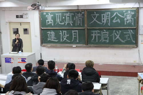 范晓光在活动启动仪式上讲话。她简要介绍了学院2018年度公寓工作取得的成绩和2019年公寓工作计划,对各班主要班干部和舍长的付出表示感谢。范晓光指出,宿舍是学生生活、学习和社会交往的重要场所,承载着生活服务、文化建设和环境育人的重要职能,要充分认识开展文明公寓建设和文化建设的重要意义,在保持安全整洁有序宿舍环境的基础上,要进一步提升全体学生文明素养,杜绝各类不文明行为,做一名有学识、有品德、有修养的新时代大学生。她要求全体学生干部要发挥模范带头作用,带动班级同学积极行动起来,按照建设标准落实好通知相关要求,通过文明公寓建设活动月,打造安全、整洁、文明、美丽的生活和学习环境,形成学生宿舍管理和公寓文化建设的长效机制。