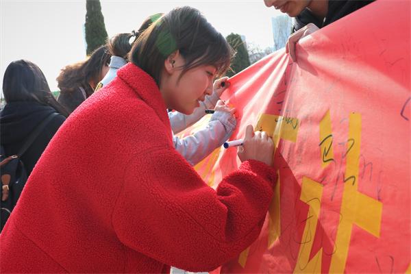 为唤起师生节水意识,加强水资源保护,3月22日,商学院在长江路校区二号教学楼前举行了“节约用水,不让任何一个人掉队”世界水日宣传教育横幅签名活动,商学院师生数百人参加活动。
