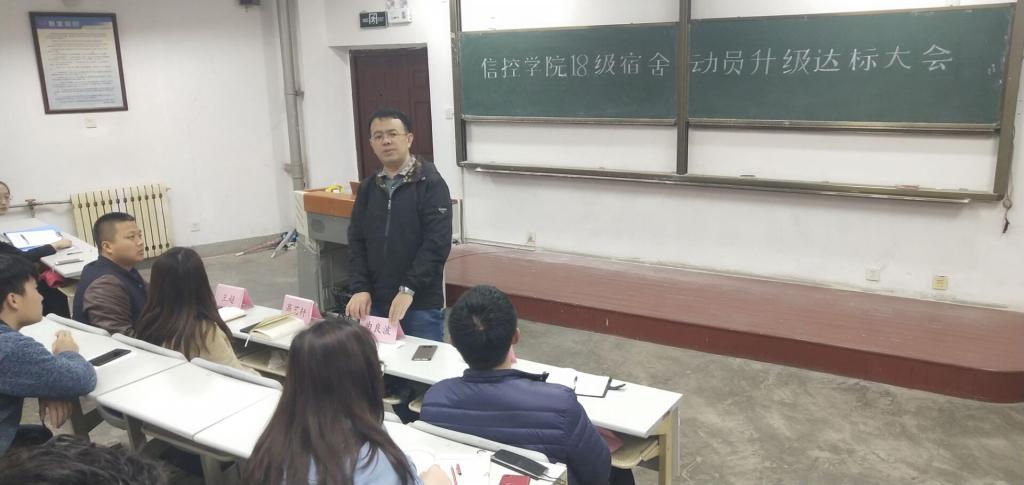 曲良波作动员讲话。2019年是省委确定的“担当作为、狠抓落实”之年,也是学校全面落实第三次党代会精神、建设特色鲜明的高水平应用研究型大学的开局之年,学院学生工作将突出安全稳定的工作主线,对学生公寓管理要“提高认识、强化责任、狠抓落实”,完善相关制度和安全规范,严格落实各项安全防范措施,扎实开展各类思想教育和检查督导工作,切实提高同学们的思想认识,及时发现和处置各类安全隐患。他强调了学校“美丽校园”建设和学院宿舍“升级达标”活动的重要意义,提出以下具体要求:一要认真学习贯彻学院《学生宿舍“达标升级”工作实施方案》,发挥班干部主体作用,做好各项工作的落实实施;二要做好春季传染病防控工作,持之以恒做好学生宿舍的通风、消毒、被褥晾晒工作,鼓励学生主动走出宿舍、走进教室、走向操场,积极参加体育锻炼,增强体质;三要高质量认真做好每日晨检工作,严格执行信息上报制度;四要增强班干部责任担当意识,努力营造良好舍风、学风,争创学校和学院“星级文明宿舍”“星级标兵宿舍”;五要重视宿舍安全稳定,做好宿舍防盗工作,提高自我防范意识和能力。最后,他表示,希望同学们以此次“达标升级”活动为契机,提高责任意识,勇于担当,在学风建设和公寓文化建设中发挥模范带头作用,深入推进“美丽校园,美丽信控”公寓文化品牌建设。