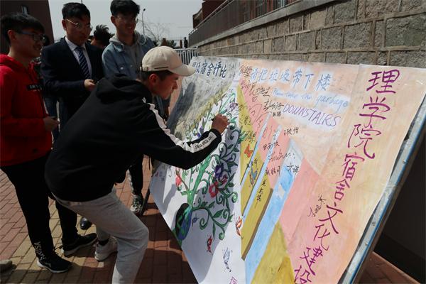 随后,申维东宣布理学院宿舍文化建设月活动开幕。在场全体师生在“宿舍文化建设月”海报上签名,响应倡议。