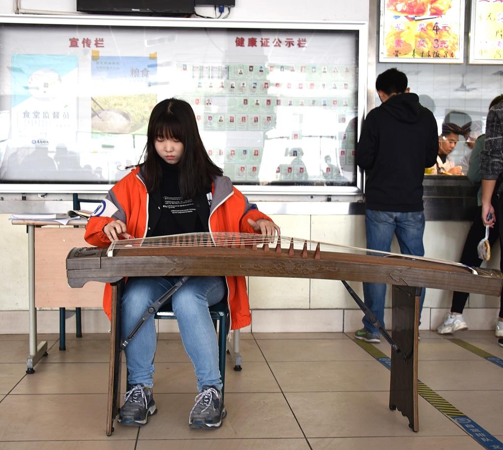 当天,熙熙攘攘的北院食堂与往日一样温馨,12:15,一阵悠扬的古筝伴奏声从食堂中央响起,演奏的正是大家耳熟能详的《我和我的祖国》旋律。主唱演员深情动人的歌声感染了现场观众,正在食堂用餐的师生纷纷被吸引,路过的同学都不由自主地放慢脚步,或拍照留影,或轻声跟唱,整个活动场面气氛和谐。