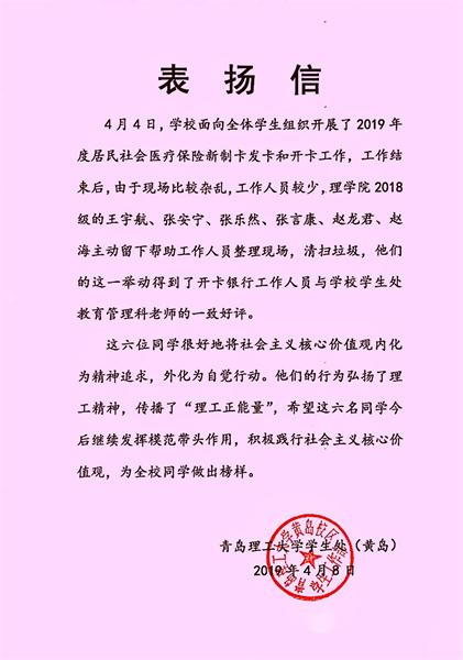 身为新时代的青年,我们要将社会主义核心价值观内化为精神追求,外化为自觉行动。4月4日,来自理学院物理182班的王宇航、张安宁、张乐然、张言康、赵龙君、赵海六名同学,在学校组织开展的2019年度居民社会医疗保险新制卡发卡和开卡工作结束后,主动留下来帮助工作人员整理现场,清扫垃圾,得到了现场工作人员以及学校的表扬,弘扬了理工精神,传播了理工正能量。