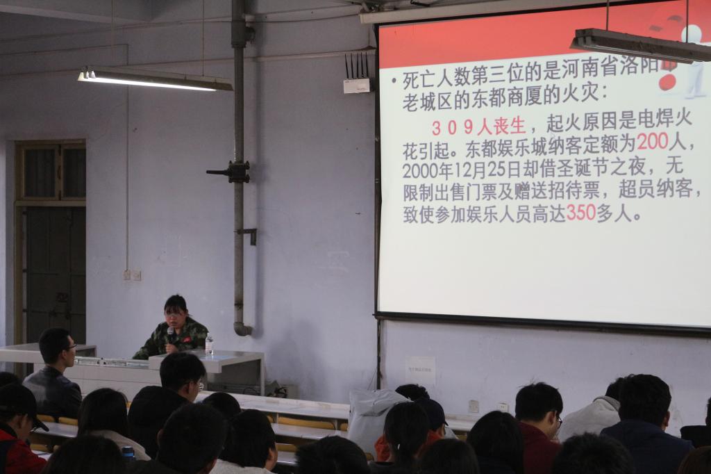 首先,于宏睿参谋通过消防局统计数据讲解了近年来国内火灾发生的频率及带来的经济损失和人员伤亡,通过幻灯片及视频的形式给同学们展示了很多火灾的案例,并结合各个案例中的实际情况教导同学们碰到火灾如何自救、逃生,怎样以正确的方式去应对各类火灾。特别是让学生了解和明确了很多以前存在误区的预防火灾以及逃生知识。随后,于宏睿参谋向大家现场演示如何使用灭火器,防烟面罩等消防器材,并邀请现场同学参与演示灭火器和防烟面罩的使用,以确保火灾发生时大家能科学有效的进行自救,与会人员深受教育和启发。最后,于宏睿参谋针对大家在消防安全方面的问题进行了解答。