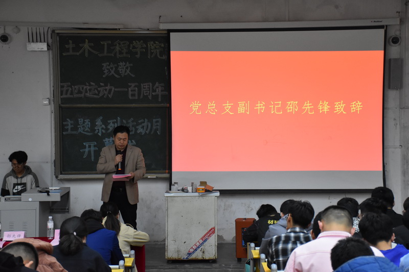 为重温红色记忆,传承五四精神,激发学生的爱国热情,4月12日,土木工程学院于一教四阶举办“薪火百年传,五四年正青”致敬五四运动一百周年主题活动月开幕式。学院党总支副书记邵先锋,学生工作办公室主任、分团委书记王中帅,辅导员杜诗琳、马蓉蓉、徐杨杨及2018级本科生、研究生各班代表参加本次开幕式。