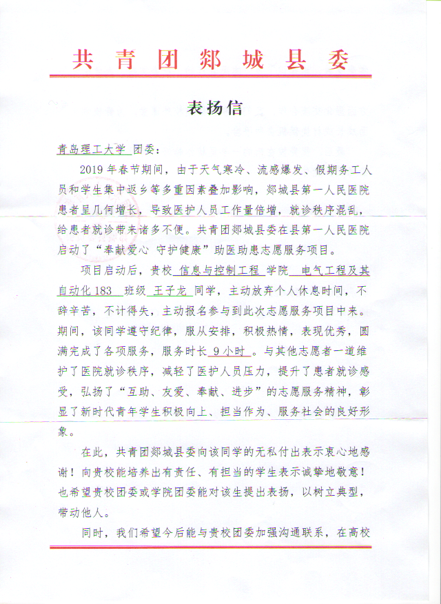 王子龙家住临沂市郯城县,在校期间就积极主动参加各种社团活动和志愿服务活动,乐于助人。被问及其志愿服务受到郯城县委表扬信感谢的时候,他表示:“这都是一个大学生应该做的,尽自己微不足道的力量帮助需要帮助的人,我觉得很开心。”王子龙乐于奉献的精神,弘扬了“互助、友爱、奉献、进步”的志愿服务精神,彰显了新时代青年学生积极向上、担当作为、服务社会的良好形象,践行了理工精神,为学校赢得了荣誉。(撰稿:高艺轩;审核:曲良波)