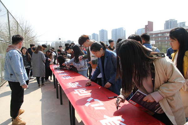 为激励和引导广大青年学生大力弘扬爱国主义精神,矢志投身决胜全面建成小康社会、夺取新时代中国特色社会主义伟大胜利的新征程,营造“青春心向党 建功新时代”主题教育实践活动的氛围,4月15日上午,高等职业学院在长江路校区开展“青春心向党 建功新时代”横幅签名活动。学院分团委书记宋晓峰、辅导员常伟、于璐和全体在校学生参加了此次活动。