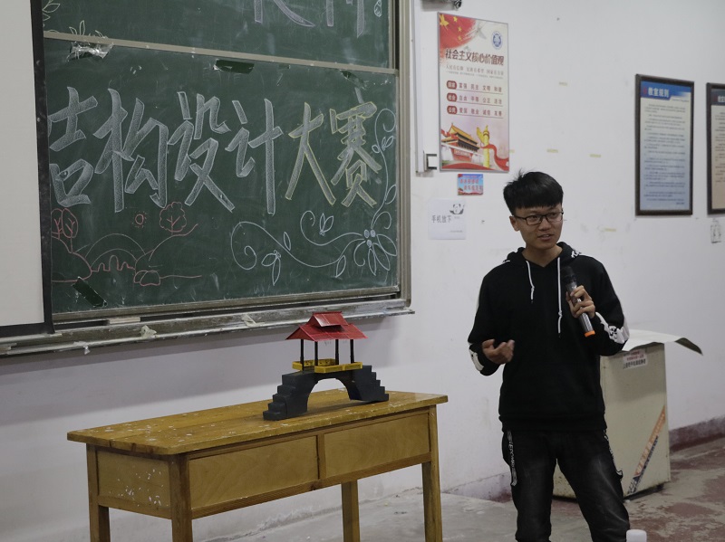 在美观组比赛中,参赛选手按签到顺序先后依次进行,每位选手有两分钟时间对自己的结构进行解说,随后评委依据结构创意、美观程度、做工精细程度和选手解说四个方面进行综合评定。参赛选手带来的作品有典雅朴素的中国古典桥梁、恢宏雄伟的现代斜拉桥、高大整齐的伦敦塔桥和富有创意的螺旋桥。最终,共6组参赛队伍获得创意奖。在承重组比赛中,先由工作人员对纸桥进行称重,然后由参赛选手在桥面中央放置辎重进行荷载。在严格遵守比赛规则前提下,同学们发挥奇思妙想,利用纸牌造成了各种款式、风格的“桥梁模型”,在造型各异的纸牌桥上每增加1kg的重量,都体现出同学们的睿智和对力学理念的掌握程度,都是智慧与汗水的结晶。最后,按各组参赛队伍的荷重比大小进行排名,评选出一等奖1名,二等奖4名,三等奖9名,其中来自土木工程学院的胡闹队以高达76.25kg的承重打破之前的比赛记录,获得了第一名。