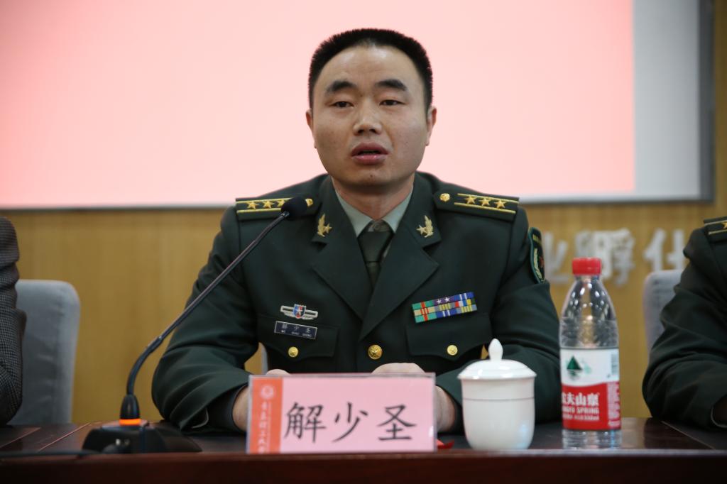 解少圣作动员讲话,他指出,征集大学生参军入伍,是党和国家做出的重要战略决策,是巩固国防、支撑民族复兴伟业的基础工程,是推动科技兴军、建设世界一流军队的迫切需要。他向广大适龄青年学生报名参军入伍、筑梦军营发出了强有力的召唤。鼓励大学生要勇于担负起历史重任,积极投身到军营生活和军队建设中来,到军营绽放报效国家的青春梦想,书写与众不同的出彩人生。