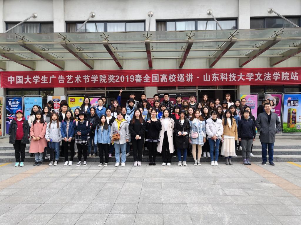 4月12日,“中国大学生广告艺术节学院奖2019春全国高校巡讲”在山东科技大学文法学院一楼报告厅举办。365完美人文与外国语学院18级广告学专业学生做为认识实习的一项重要内容,在刘鹏老师的带领下参加此次活动。碧生源控股有限公司、上海锐澳酒业营销有限公司、携程旅行网、恒安集团七度空间、贤哥食品、涂缓缓、太阳雨集团等七个企业的代表、广告人集团代表以及山科大广告学专业学生参加活动。