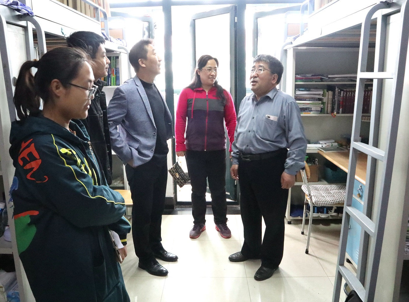 4月24日,理学院院长于进伟、党总支书记邹传波、副书记刘聘以及全体学生工作干部走访宿舍,了解学生思想动态和学习生活情况,并对宿舍安全卫生进行了全面检查。