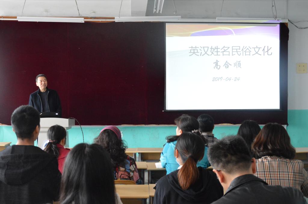4月24日下午,人文与外国语学院第42期新论语讲坛科研讲座在长江路校区1教527教室如期举行。此次讲座由英语教研室高合顺教授主讲,题目为“英汉姓名民俗文化”。学院部分师生参加了此次讲座。