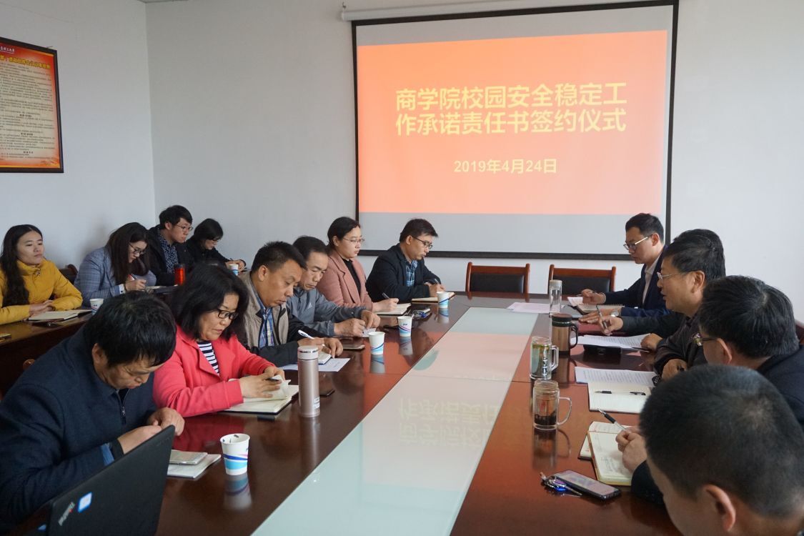 为落实国家、省、市和学校有关安全稳定工作的法律、法规及相关文件会议精神,落实学校安全稳定责任制,健全学校安全责任网络,深化平安校园建设,确保学校和学院正常教学、工作与生活秩序,商学院于近日举行校园安全稳定工作承诺责任书签约仪式,商学院班子成员、全体教研室主任、学生工作干部参加会议,党总支书记王粲主持会议。