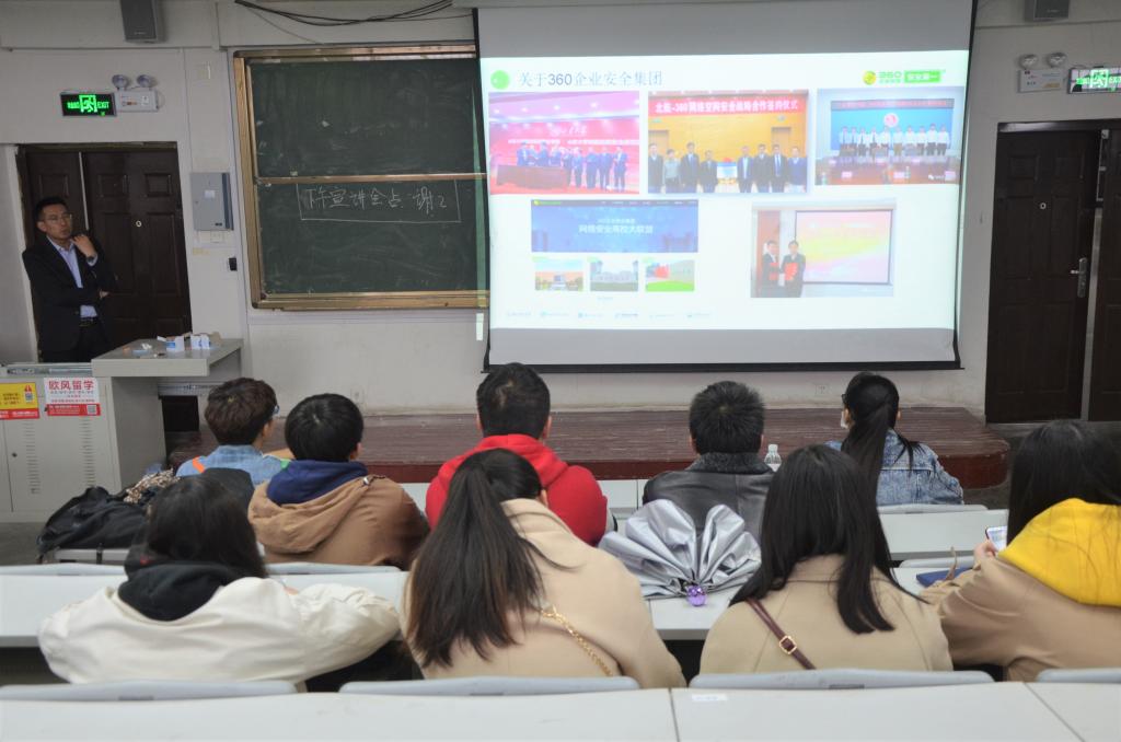 为向学子提供更多的企业工作岗位和实习机会,4月28日下午,管理工程学院于阶302举办360企业安全集团招聘宣讲会。360企业安全集团校企合作大区经理韩同庆、人才培养基地校企合作推广经理付正钦出席此次宣讲会。韩同庆担任此次宣讲会主讲人。