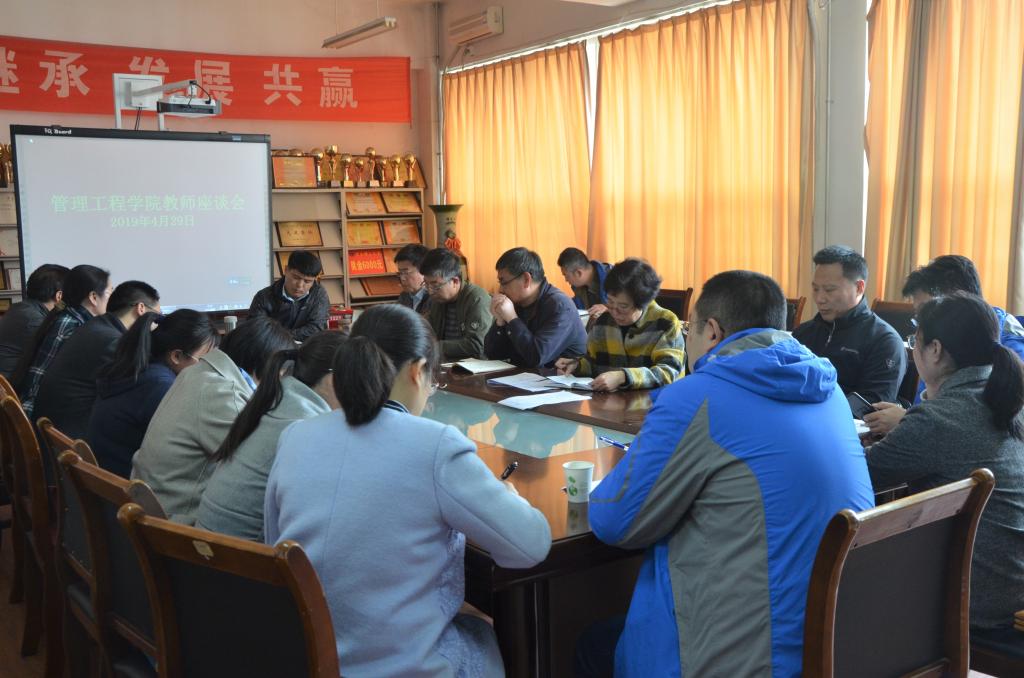 4月29日下午,管理工程学院在黄岛长江路校区2号教学楼410会议室召开教师代表座谈会。学院院长荀志远、党总支书记梁虹、教学副院长申建红、党总支副书记于利俊、各教研室、实验室13名教师参加座谈,会议由申建红主持。