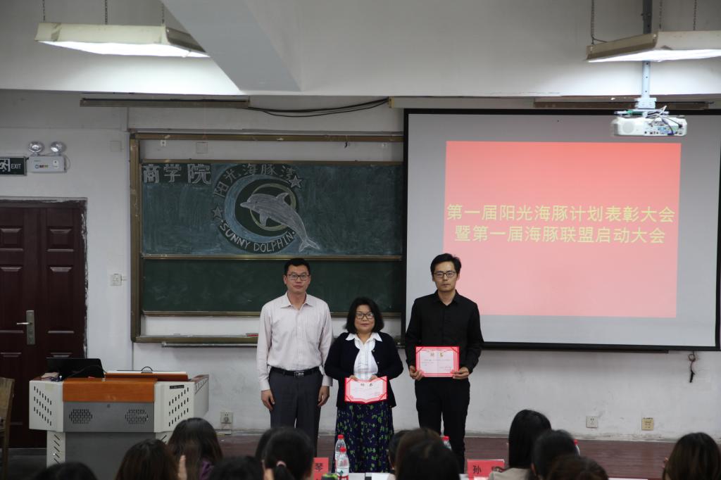 杨洪敏简要介绍了上一期阳光海豚计划取得的成绩,以及在阳光海豚计划基础上成立海豚联盟的目的和意义。在过去的一个学期里,阳光海豚计划所有参与人员平均分提高6.41分,50位海豚挑战者共计消灭挂科95科,多名海豚挑战者实现了0挂科。辅导员王军宣读表彰决定,海豚导师代表向“阳光海豚计划”中表现优秀的海豚领航员、海豚挑战者颁发了商学院院长王曙光教授书写的表扬信和祝福信。
