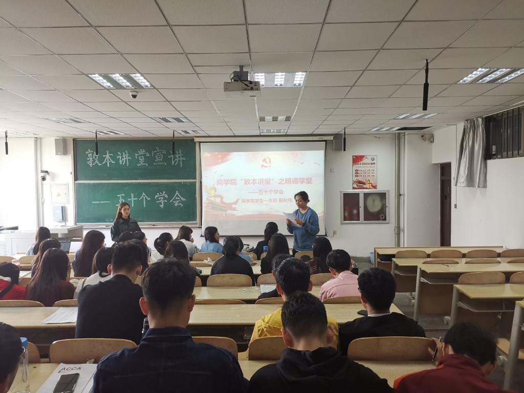 为引导学生树立良好的道德风尚,培养学生优秀品质和行为习惯,5月8日至12日,商学院于二教阶204举办商学院敦本讲堂﹒明德学堂第一讲,学生党员作为主讲人,深入商学院所有班级进行“50个学会”主题宣讲。