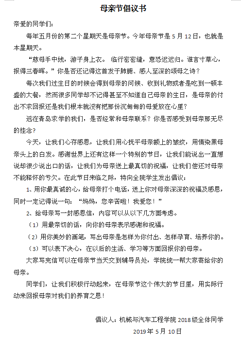 在母亲节前夕,2018级全体同学向全院同学发起倡议,提议母亲节当天,主动给自己的母亲打一个问候电话,向母亲深情告白,以简单质朴的方式来表达对母亲深深的敬意。同学们把对母亲的思念或是想对母亲说的话写成一封信,由学院统一邮寄给母亲,表达对母亲真诚的祝福和感激。