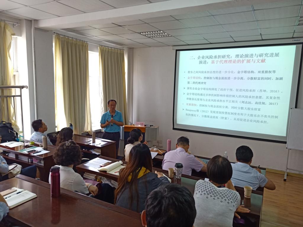 刘志远教授演讲主题为“企业风险承担研究:理论演进与研究进展”,他从成果的角度切入,围绕三个方面展开宣讲。首先,刘志远就企业为什么需要承担风险进行了解读,提出收益与风险如影随行的观点。随后,他重点从企业风险承担研究:理论演进与研究进展方面进行了深入剖析,基于代理理论、高阶理论、行为理论、能力基础理论等进行拓展并解读了相关研究文献。刘志远基于自身研究,揭示了衡量问题的角度及企业主体各因素的风险偏好,并阐述了自己对未来研究的若干思考。最后,刘志远与现场师生展开热烈讨论,进一步实现学术思想的碰撞。