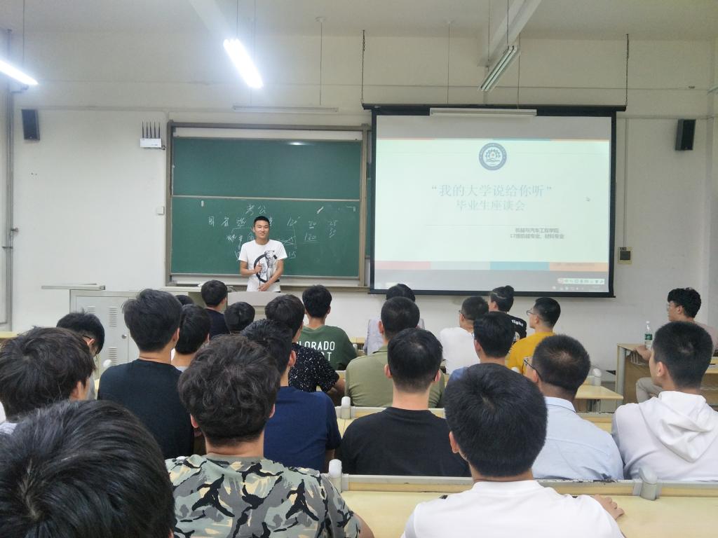 6月20日,机械与汽车工程学院“我的大学说给你听”2019届毕业感悟分享会在主教楼B126召开,2015级优秀毕业生代表李帅、李虎、王志浩、孟庆恩、王昌利作为考研、考公、就业的典型代表参加本次分享会并作主讲人。会议由张翠芳主持,2017级机械、材料专业学生代表共100余人参加。