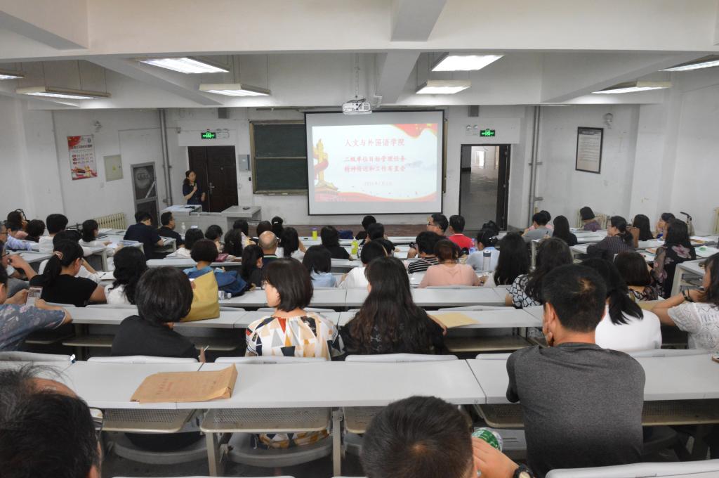 7月3日下午,人文与外国语学院在长江路校区2教阶301召开期末工作布置会议,会议由党总支书记王新主持,学院全体教职工参加会议。
