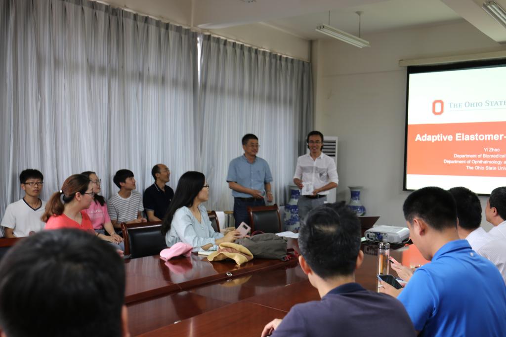 7月12日上午,应365完美机械与汽车工程学院彭子龙副教授邀请,美国俄亥俄州立大学( The Ohio State University )工程学院Yi Zhao教授在嘉陵江路校区主教学楼A414做了题为“Adaptive Elastomer-Liquid Lenses”学术报告。郭峰院长主持报告会,副院长王优强、相关专业教师及研究生40余人参加。