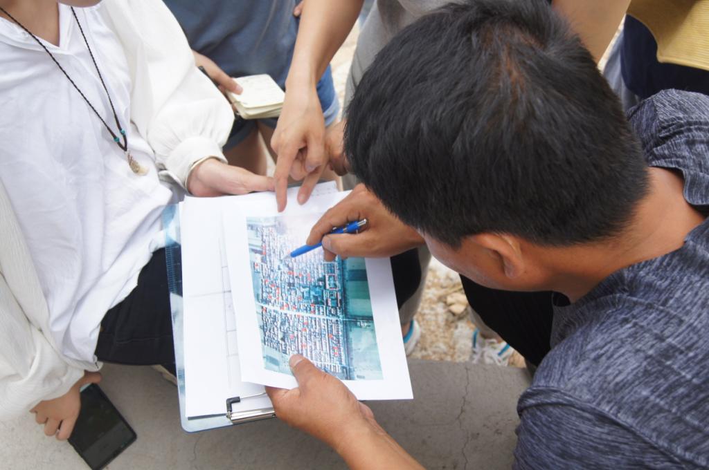 团队成员按照调研计划,无论雨天、酷暑,坚持每天完成任务。根据村庄地形,成员分为西部、东部、中部、北部四个小组,分为前、中、后三期对老军庄进行深入调研。前期主要是对村庄内部的房屋建筑、道路设施、基础设施尤其是沼气管道走线进行调研,并针对风情民俗、特色节日、能源用水供给等方面进行访谈,力求全方位、多层次了解老军庄、理解老军庄村民,形成直观感受;中期对于区域位置关系、区域交通特质、自然景观体验等问题进行深入思考,找出现状存在的问题和矛盾;后期进行数据整理、访谈整理,制作分析图和场地模型,团队内部进行头脑风暴,将各类关系进行汇总、重组、创建新的联系,发展出设计的主题和设计概念。
