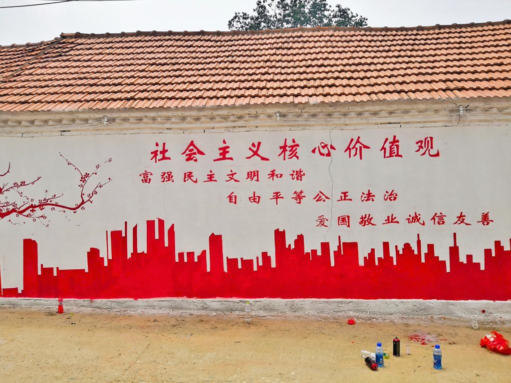 志愿者们到达目的地后与村支书进行了良好交流,在活动过程中,充分发挥专业优势,结合盘石店镇的基本情况给村庄进行规划,以弘扬时代精神、倡导文明新风为目标,以反映社会主义核心价值观为主要内容,在各主要街道为他们绘制了“社会主义新农村”主题墙绘。在墙绘版面设计与画面呈现效果上,更专业的将文化背景融入到墙绘内容中,在艺术层面促进文化的传播与保护。通过给村庄主要干道进行墙绘,也增强了乡镇的文化氛围以及艺术魅力,结合当地文化特色使其更具影响力。