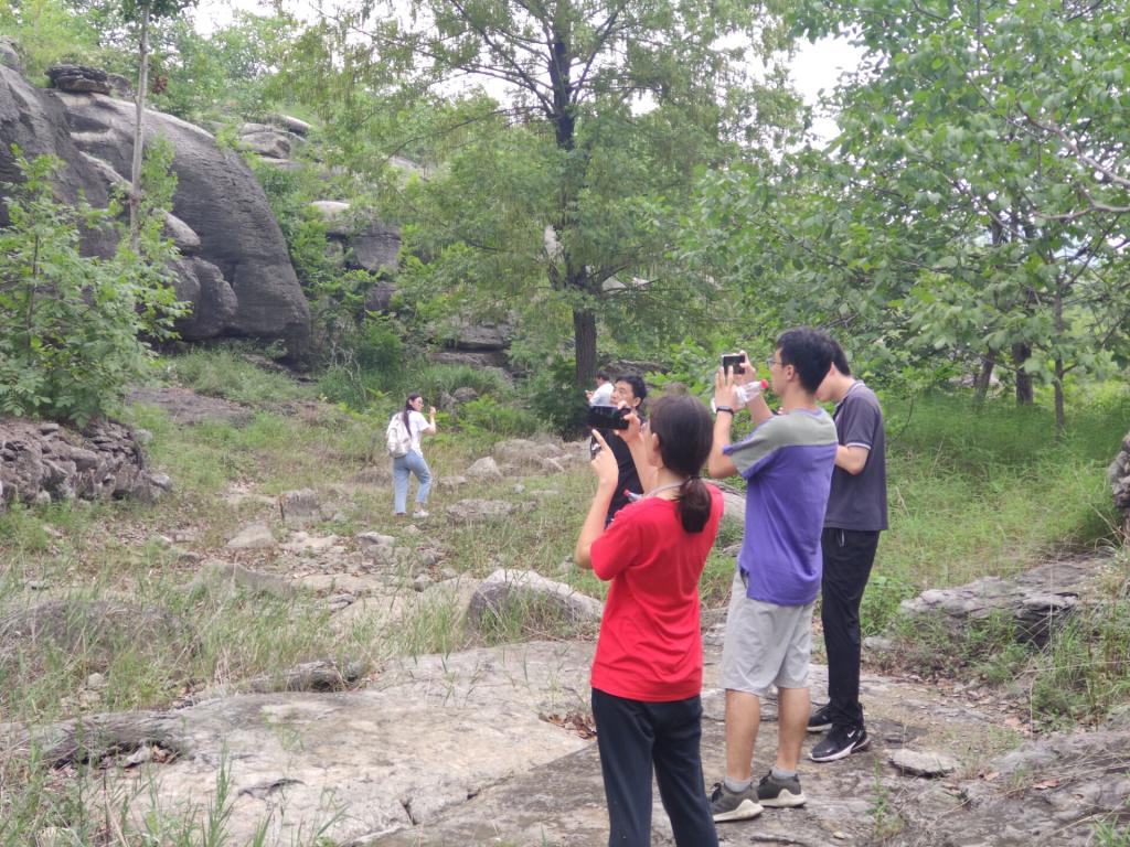 7 月 24 日下午,团队成员在牛角峪村第一书记李军权的带领下,考察了荷花湾村、中华奇石城等地点,领略了沂蒙老区的风景如画,在李书记的讲解下, 团队成员进一步感受牛角峪村周边的生态文化现状与旅游发展状况。