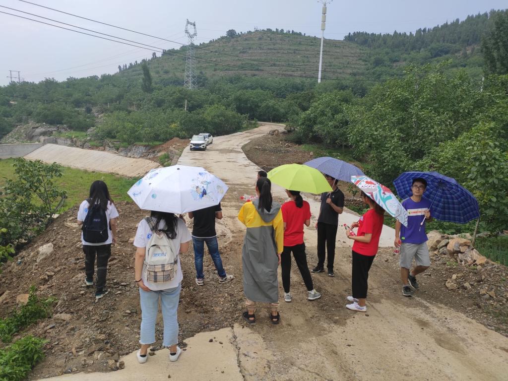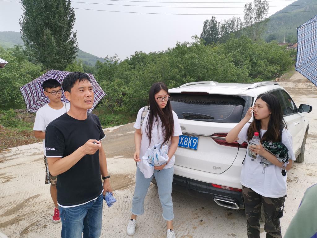 7 月 25 日下午,团队成员冒雨前往牛角峪村北部山沟,实地勘察北沟的自然条件,并与牛角峪村第一书记李军权讨论北沟的规划设想,初步拟定了规划意向。