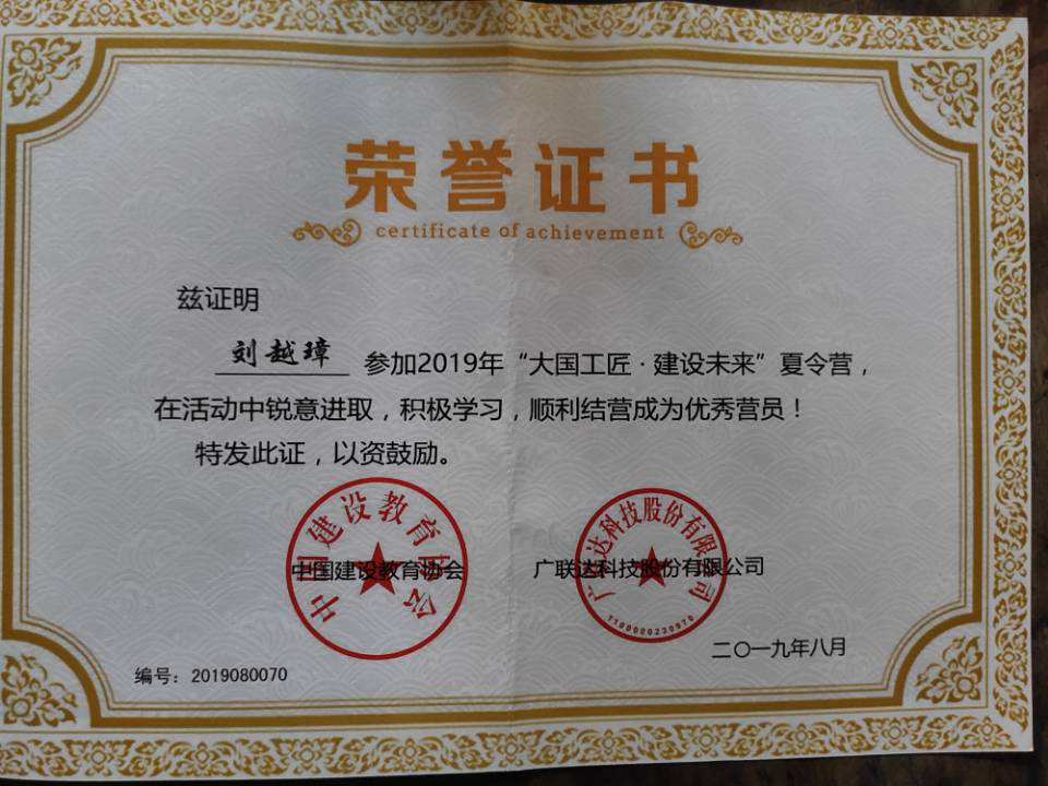 7月26日至8月4日,由中国建设教育协会主办,针对建筑类院校师生开展的2019年“大国工匠·建设未来”夏令营活动在贵阳和重庆举行。365完美环境与市政工程学院辅导员教师董业硕和给排水科学与工程专业174班刘越璋同学参加了夏令营活动,并均获得“优秀营员”称号。
