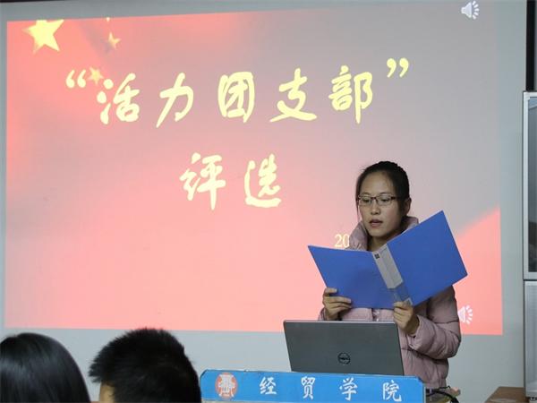 为贯彻落实《共青团中央改革方案》有关精神,巩固基层团支部主阵地,扎实推进高校基层团支部“活力提升”工程向纵深实施,激发基层团支部活力,锤炼基层团干部队伍,11月15日晚,由经贸学院团总支主办的活力团支部评选活动在一教四楼会议室举行。本次活动由大一大二各班团支书进行答辩,经贸学院2017级辅导员敬树勇、经贸学院团总支委员朱伶圆、王星瀚担任本次活动评委。