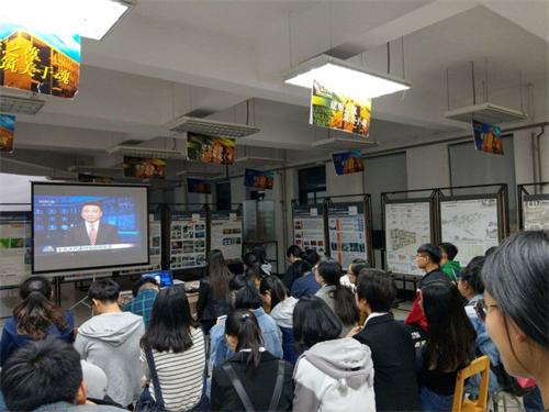 近日,为了庆祝党的十九大胜利召开,贯彻落实学校、学院有关主题教育工作要求,将学生队伍思想建设和学风建设有机统一起来,日前,建筑学院每晚在建筑馆二楼大厅组织学生观看新闻联播,并开展了观后感评奖活动。