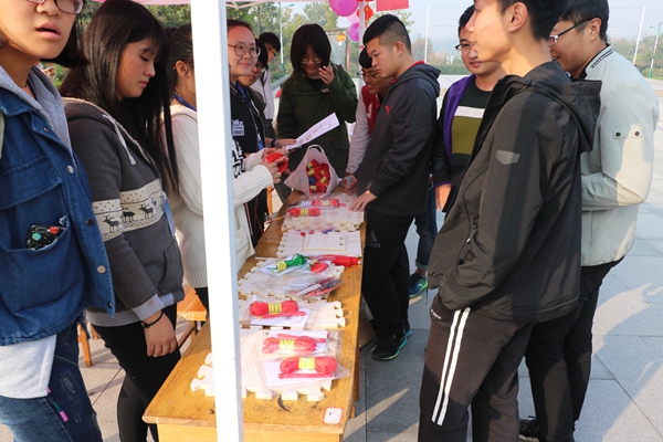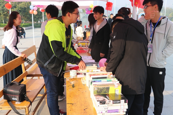 在图书馆前广场,读者服务协会于豪团队借助“贝壳图书漂流”软件,举办‘百本图书一路“漂”红’活动,即将100本红色爱国经典及专业学科图书,以“漂流瓶”的形式通过大家喜闻乐见的扫码“漂”向参与者,活动结束时100本图书全部“漂”出;建筑模型协会展示了协会成员制作的红色建筑模型,并现场教授制作“中国结”,讲述作品的红色故事;兰亭书画协会用爱国题材现场创作,一副“翰墨传情喜迎十九大,山河吐翠史耀五千年”对联,表达了他们对祖国母亲的希冀;青音吉他社自编自演的一曲《我爱你,祖国》,表达了学子涓涓青年志,志诚报国心;心语协会组织参与者写下与祖国的约定,粘贴在展示板上;晨曦剧社以“朗读者”形式领读经典名著,引导学生树立“国兴我荣,国衰我耻”的价值观念。