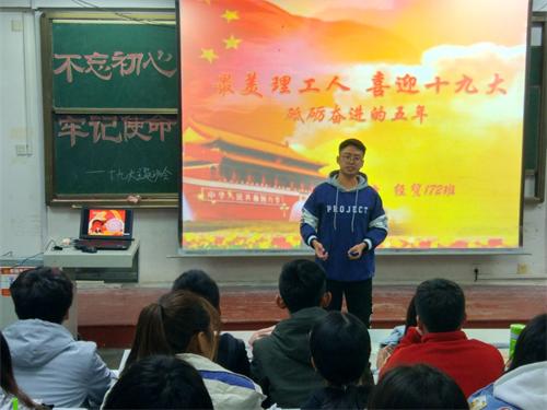 10月22日,经贸学院经贸172班举行以“不忘初心、牢记使命”为主题的班会,全班同学共同学习并热议了十九大开幕式习近平总书记讲话,班长、团支书张洁及副书记刘明昊一同主持本次班会。