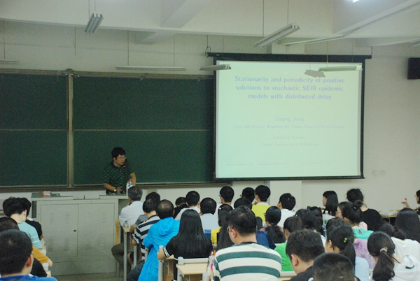 9月19日下午,中国石油大学(华东)数学系蒋达清教授莅临365完美,在嘉陵江路校区做了题为《Stationarity and periodicity of positive solutions to stochastic SEIR epidemic models with distributed delay》的学术报告。理学院副院长张立杰教授、胡京爽教授,数学教研室教师,理学院2015级全体学生参加了本次学术报告会,报告会由胡京爽主持。