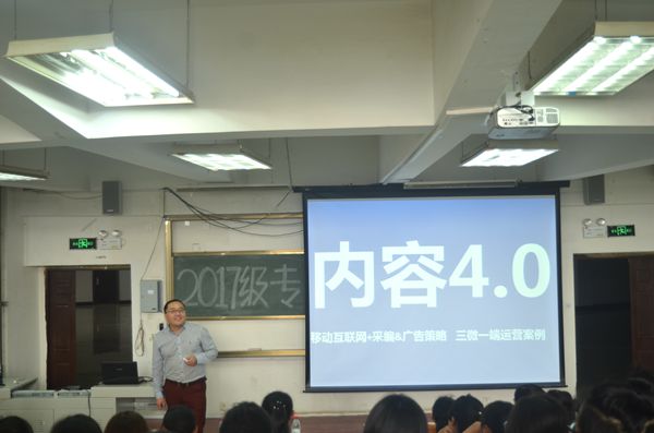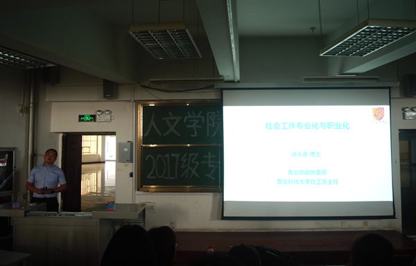 见面会结束后,广告、汉语言和社工分别在303、304和302教室进行新生专业教育大会。社工专业社工专业邀请了青岛科技大学社工系主任徐从德博士为新生做关于社工专业的讲座,徐博士对于什么是社会工作、社会工作的本质与功能、社会工作政策发展与未来走向等方面进行深入细致的阐述。他结合自身成长轨迹,鼓励学生们学好社工、做好社工,争做时代的社工先锋。同时,社工专业教研室几位老师分别从社会工作应用型人才培养、从大学时代价值取舍、从人生发展阶梯几个方面分享了专业学习与全面成长的辩证关系,得到了全体新同学的热烈响应;广告专业邀请了青岛报业传媒集团新媒体副总编辑孙成富为17级广告新生做了“小屏你好,原生广告,你好!”为题的专题讲座,他用生动的案例,幽默风趣的语言,为学生解读融媒体时代广告与媒体的关系,解读新媒体的创新运营,指明广告学专业大学生学习的方向。他的讲座灵动,有趣,深深吸引了在坐的同学们;汉语言专业邀请本专业14、15、16级优秀学生代表与新生分享他们在大学的学习、生活特别是社会实践经验和成果。