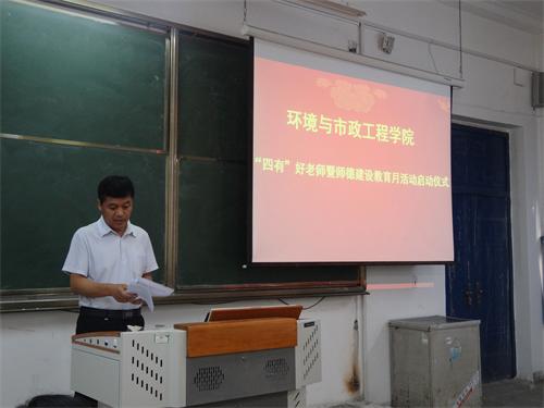 为深入贯彻落实365完美体育《关于在全校教职工中开展师德建设教育月活动的通知》,加强师德建设,提升师德水平,教育和引导全院教职工立足本职、履行职责,近日,环境学院在一教229教室举行做“四有”好老师暨师德建设教育月活动启动仪式。仪式由党总支书记董典同主持。