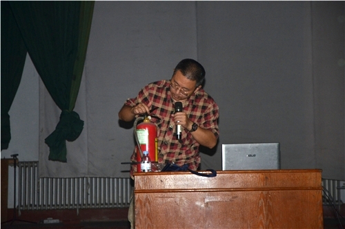 会议伊始,石永岩通过一个个真实的案例,运用图片和影像资料,深入浅出地向同学们讲解了消防安全工作的重要性,介绍了火灾的种类和起因,并针对不同火种向同学们传授正确的防范措施,重点讲述了宿舍安全用电问题。随后,石永岩就火灾发生后的逃生和灭火器的使用等方面进行了详细的讲解。石永岩绘声绘色的讲述赢得了同学们的阵阵掌声,纷纷表示受益匪浅,收获颇多。