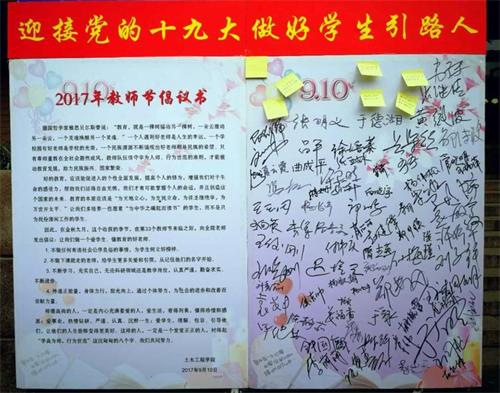 在第33个教师节来临前夕,土木学院向全校教师发出师德倡议,践行“迎接党的十九大,做好学生引路人”节日主题。